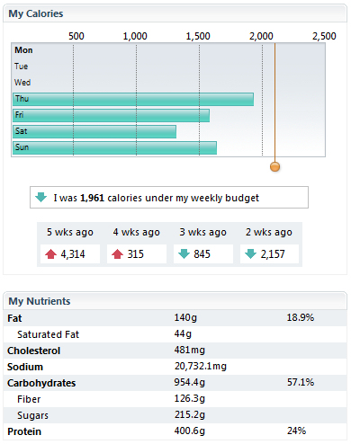 I missed a week!  Last week I didn’t post an update because I was sick as a dog!  You can see from the graphic above that I wasn’t bothering to record what I was eating (I was eating), or doing much of anything.  I did end up losing 3.09% of my starting weight for the week, which is kind of cheating since I was sick – but it wasn’t because I was dehydrated (I’ve continued losing weight this week).  That brings my total weight loss for the last eleven weeks to 12.23%.  That puts me a little over half way towards my goal, and I’ve got fourteen weeks to do it.  That clock is ticking!